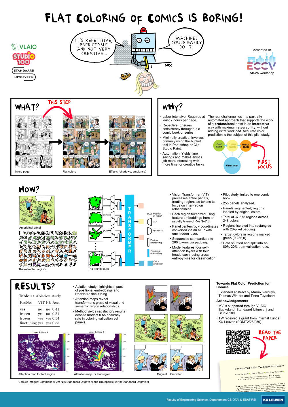 I'm nine months into my PhD, researching automated flat coloring techniques for comic books. My preliminary findings were compiled into a four-page extended abstract, which was accepted at the AI4VA workshop (AI for Visual Arts) held in conjunction with ECCV 2024 in Milano, Italy. The poster session took place on January 29, 2024, and was a cool experience. I had the opportunity to meet many insightful individuals who are also exploring AI and comics. It was enriching to discuss our innovative work in the field of visual arts and AI!