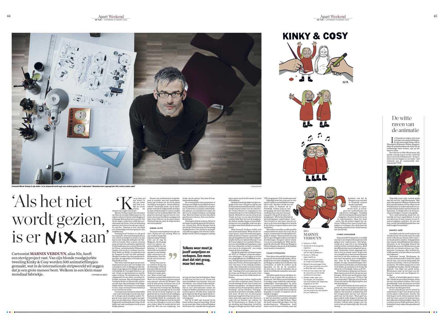 In 2012, I was working on an animated film production of Kinky & Cosy. I co-produced with Ellipsanime (Paris), scripted and directed five hundred 30-second clips of the terror twins. We did the voice recording in Hollywood (USA) and the design and animation happened in Wuhan (China), Angoulême (France), Leuven (Belgium) and Charlerloi (Belgium). The Flemish newspaper De Tijd made this portrait of me as an cartoonist - entrepreneur. If it is not readable on your screen, you can download it here.