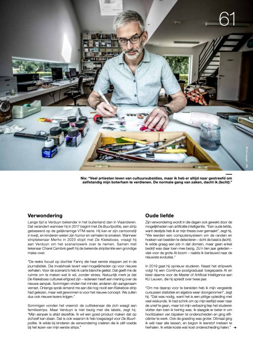 In the September issue of Sonar, there is an extensive interview with Nix about the fascinating and unpredictable path of his career. From electronic engineer to comic book author/animator and then back to being a PhD student researching the use of AI to create comics and animations. The underlying theme throughout his journey has been the drive to realize dreams. Sonar, the KU Leuven magazine that highlights its researchers three times a year, sent its best writer and photographer to Nix’s studio (text by Pieter-Jan Borgelioen, photos by Rob Stevens).